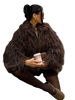 Person in a fluffy white coat holding a mug in a snowy landscape with a dog.