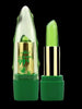 Green lipstick with gold accents, swatch on skin, and close-up of lips wearing the product.